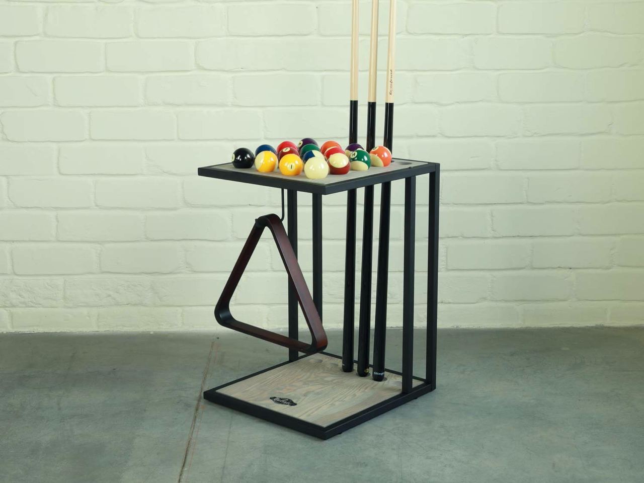 Stojak na kije do Buffalo – piękny stojak w loftowym stylu na którym można ustawić 6 kijów bilardowych, komplet oraz trójkąt. Wykonany z litego drewna w polaczeniu z metalowym profilem