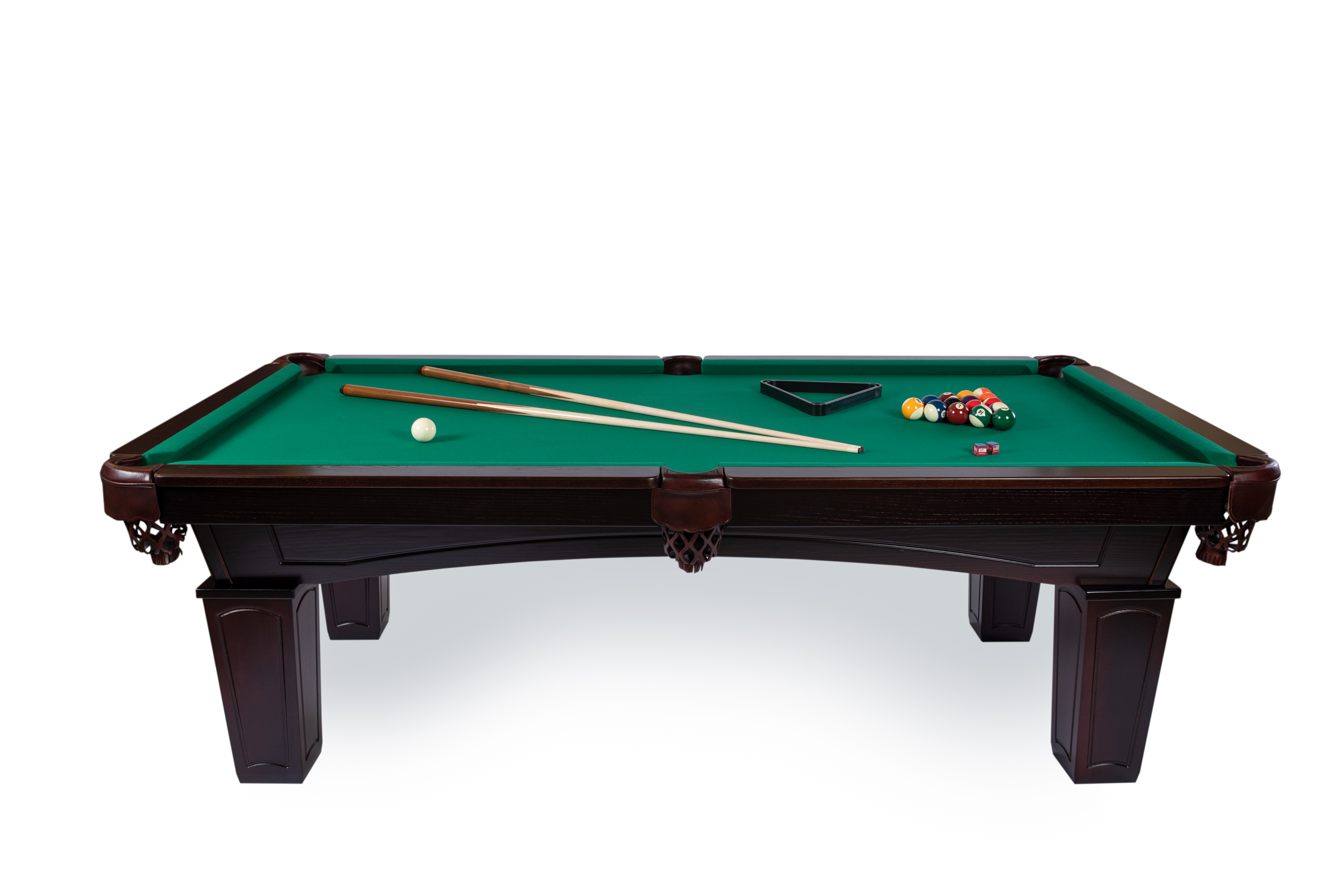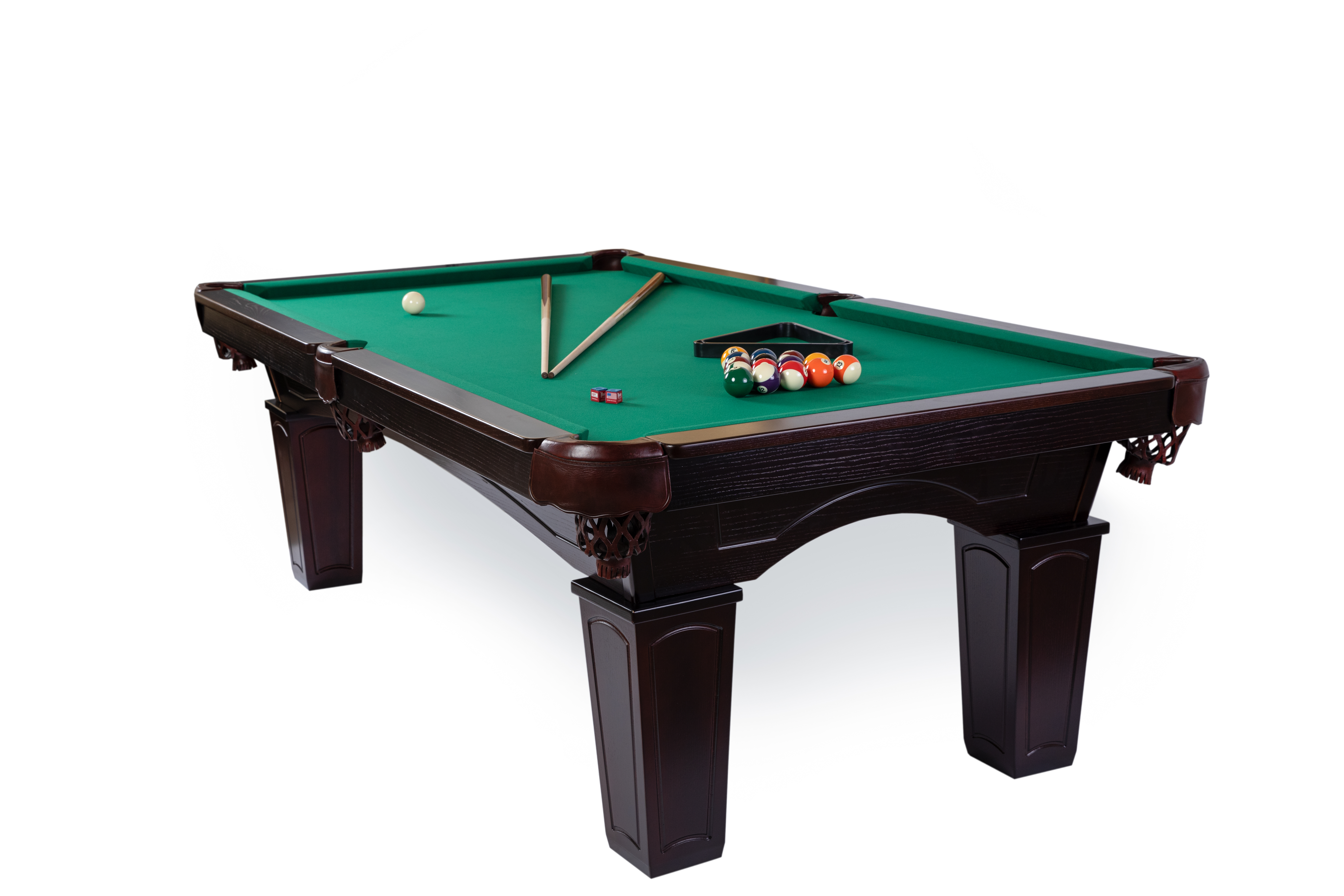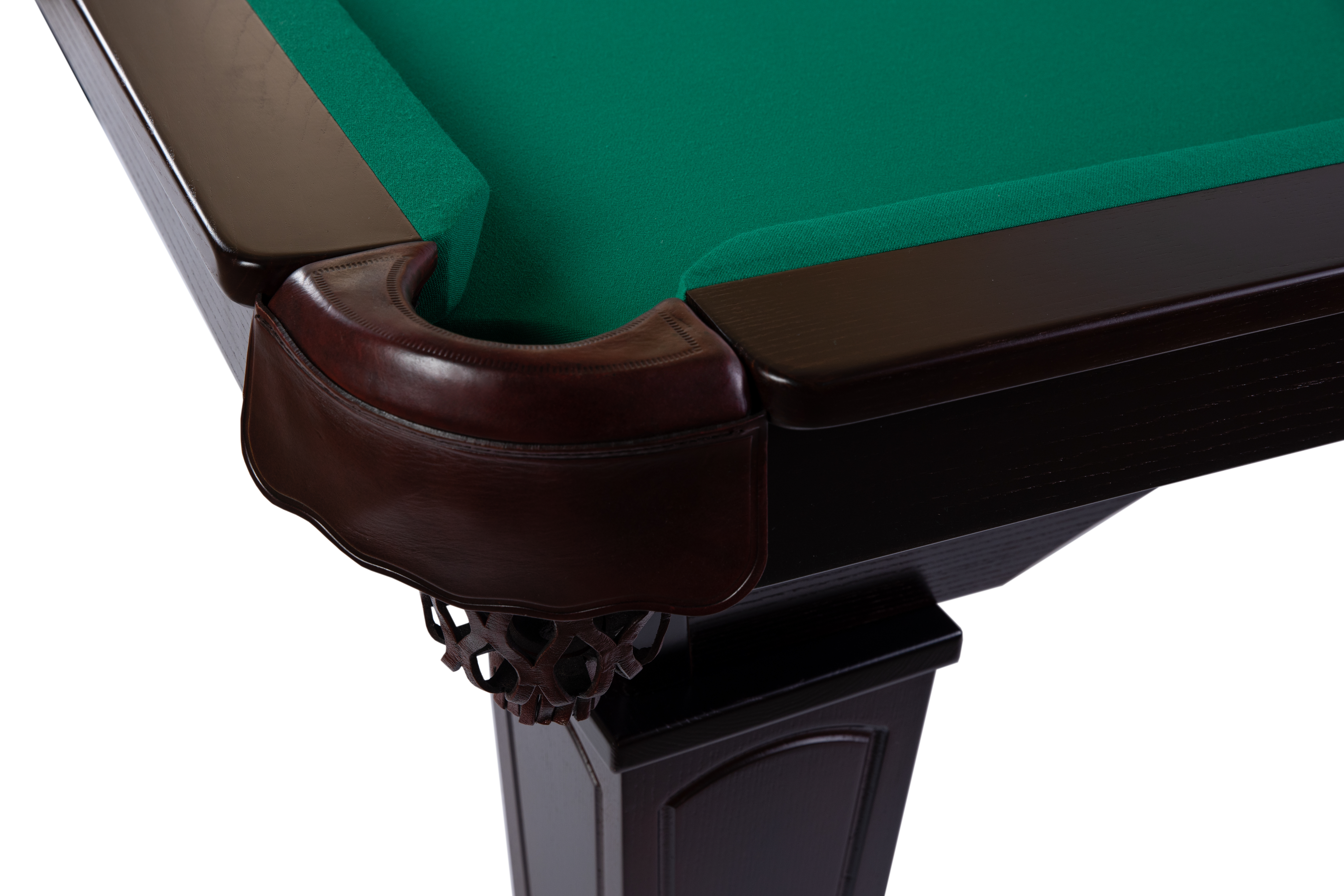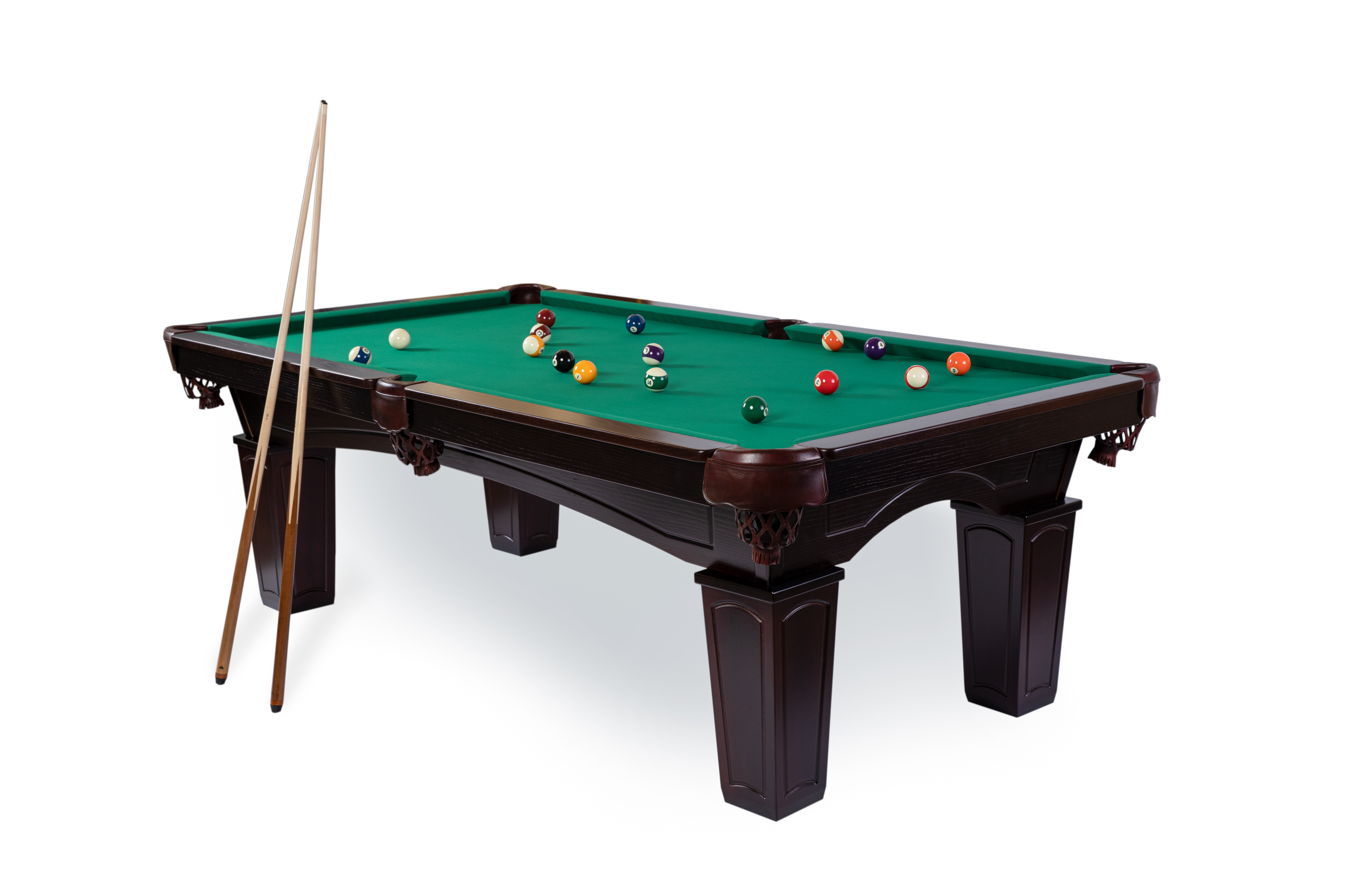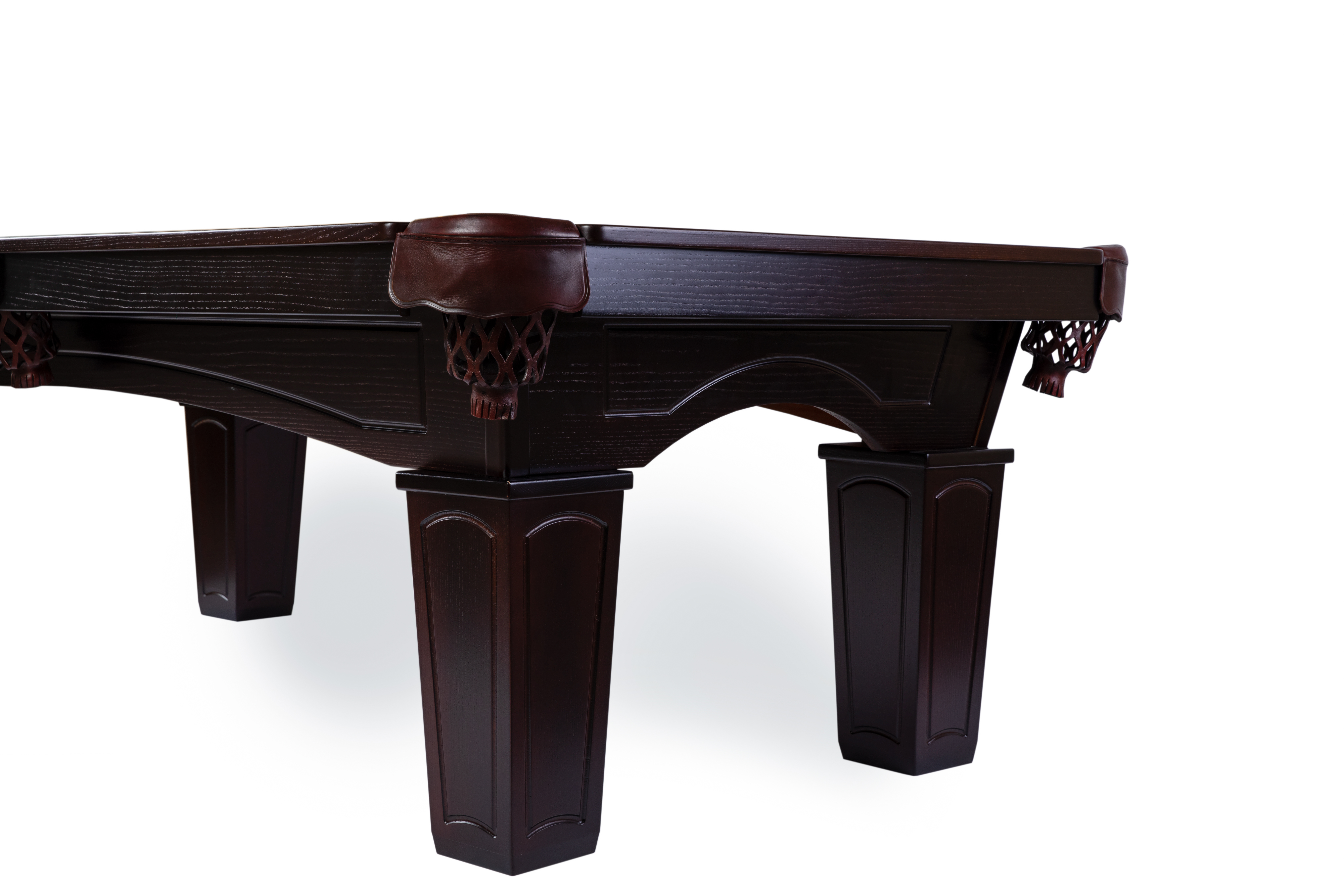 The Texas billiard table, made of solid wood, features tapered rectangular legs, a 3-piece slate slab, leather pockets, and K66 profile rails. It serves well both in a bar and in a private building. The crown is made of solid ash wood. Customization is available upon individual order.